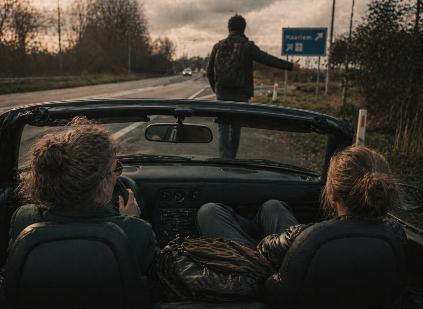 Drie kwartier later rijdt Vrouwtje Jas Amsterdam weer uit. Hij staat er nog, langs de kant van de weg, met zijn duim omhoog. Vrouwtje Jas besluit om te vragen waar hij naartoe wil.