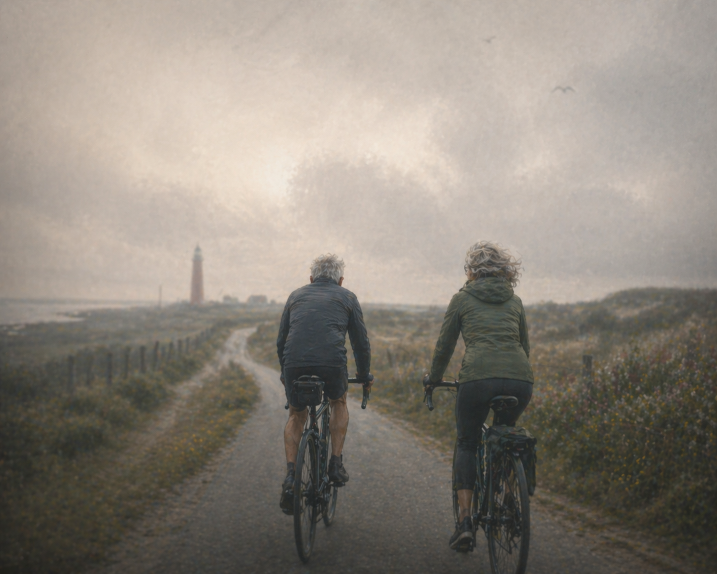 Hij zet een tandje bij en zegt: “Ik zag je op de boot al staan en heb nagelaten om je aan te spreken. Maar ik houd van praten en ben blij dat je nu naast me fietst. Ik ben wel een klets hoor; als je er genoeg van hebt, moet je dat maar zeggen.”