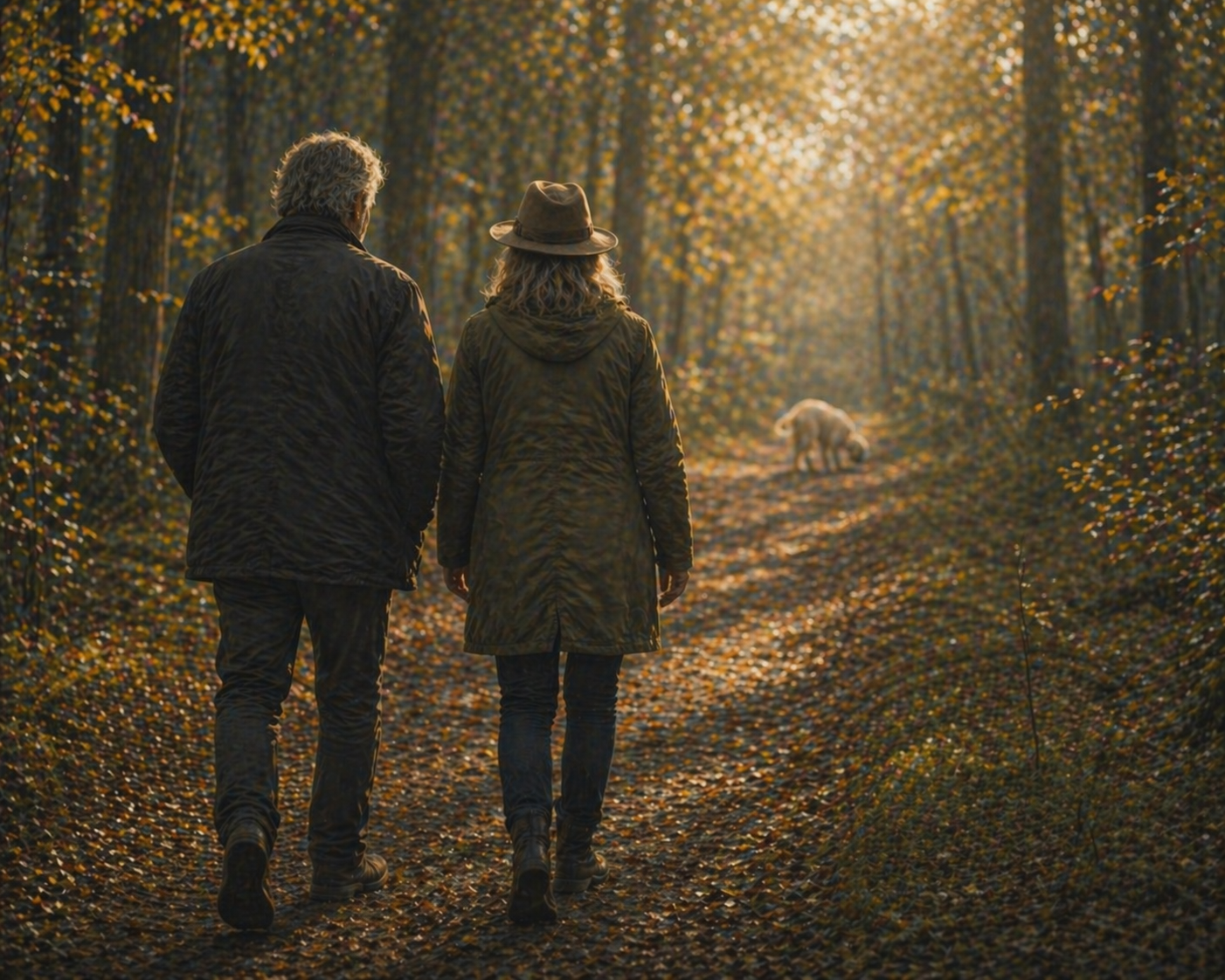 Ze lopen langs een open plek. Het licht valt tussen de bomen door.