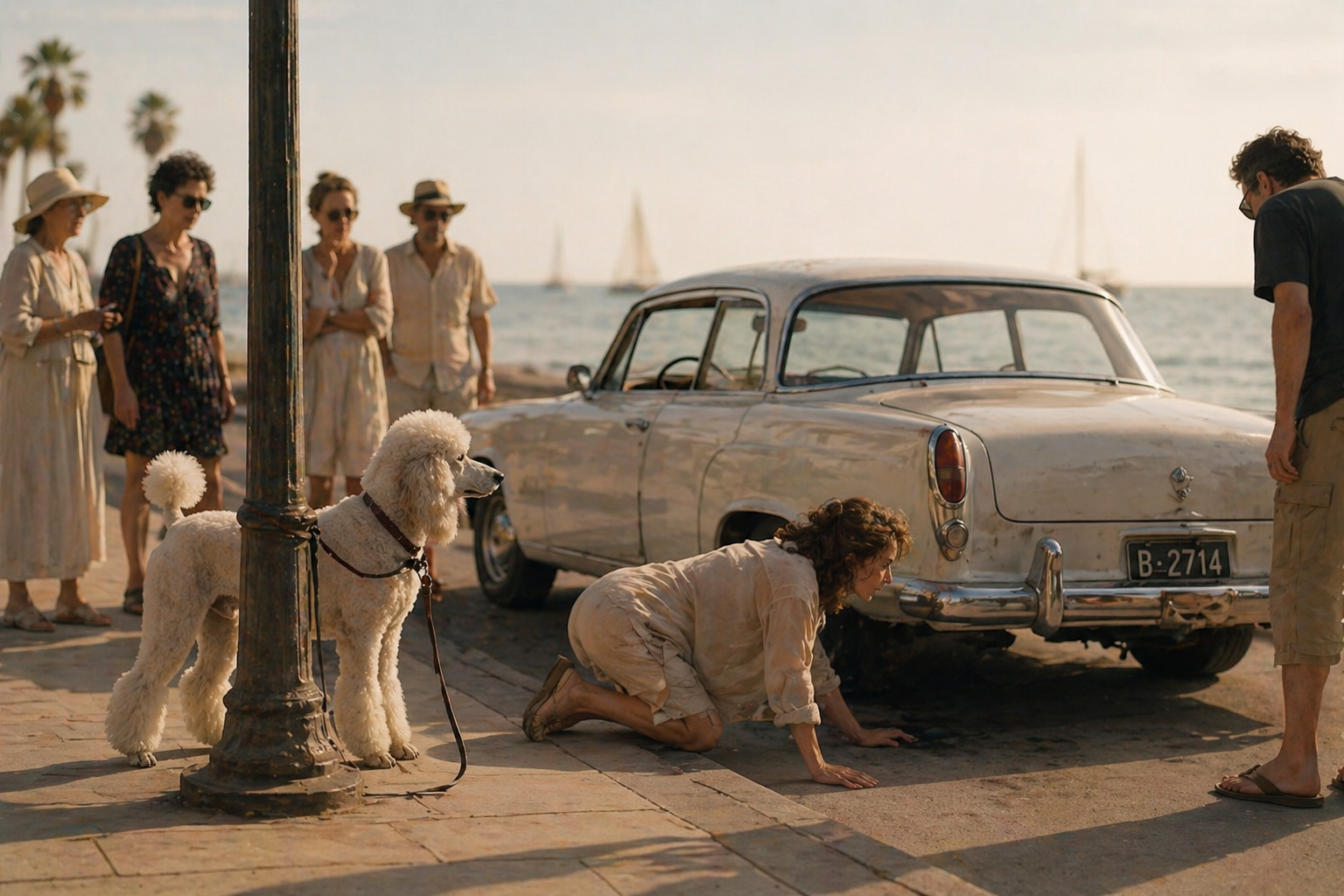 De hond trekt haar van de stoep af. Ze wil zelfs op haar buik onder de auto kruipen. Dameshonden doen zoiets niet. Vrouwtje Jas begrijpt het niet. Totdat ze gejammer hoort. Gepiep, als van een cavia. Zachter, veel zachter.
